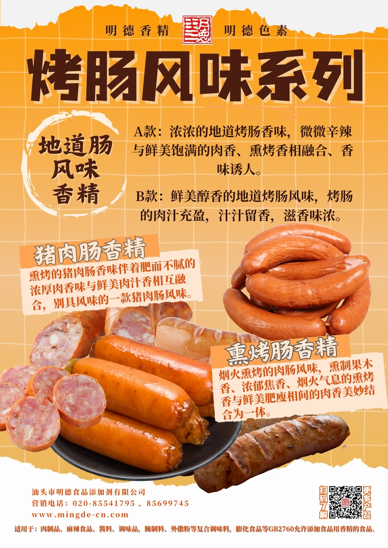 明德烤腸風(fēng)味系列香精 煙熏肉香 層次真實(shí)汕頭市明德食品添加劑有限公司推出的烤腸風(fēng)味系列香精,覆蓋地道腸風(fēng)味香精、豬肉腸香精、熏烤腸香精等多種調(diào)性。產(chǎn)品風(fēng)味真實(shí)、留香穩(wěn)定,適用于肉制品、復(fù)合調(diào)味、腌制與外撒粉等B端工廠,幫助快速打造具有記憶點(diǎn)的烤腸類風(fēng)味。